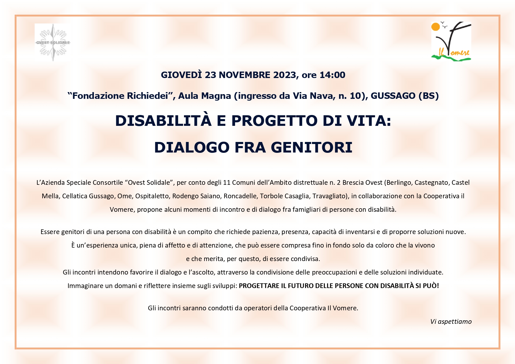 L’Azienda Speciale Consortile “Ovest Solidale”, per conto degli 11 Comuni dell’Ambito distrettuale n. 2 Brescia Ovest (Berlingo, Castegnato, Castel Mella, Cellatica Gussago, Ome, Ospitaletto, Rodengo Saiano, Roncadelle, Torbole Casaglia, Travagliato), in collaborazione con la Cooperativa il Vomere, propone alcuni momenti di incontro e di dialogo fra famigliari di persone con disabilità.